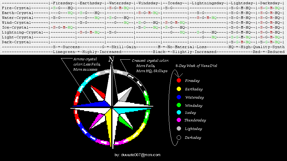 Here's a group of useful Final Fantasy XI crafting tools I've found over the years. It gives a good idea of what days are best to craft, and what direction to face for desired results. Enjoy!